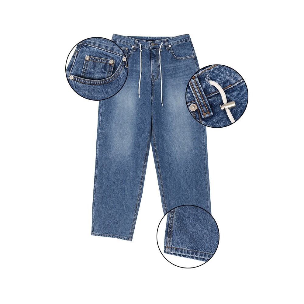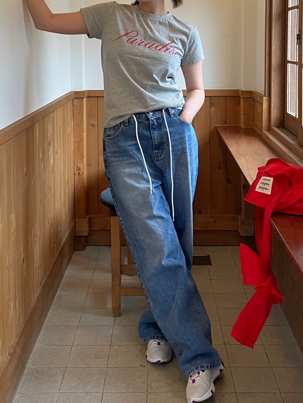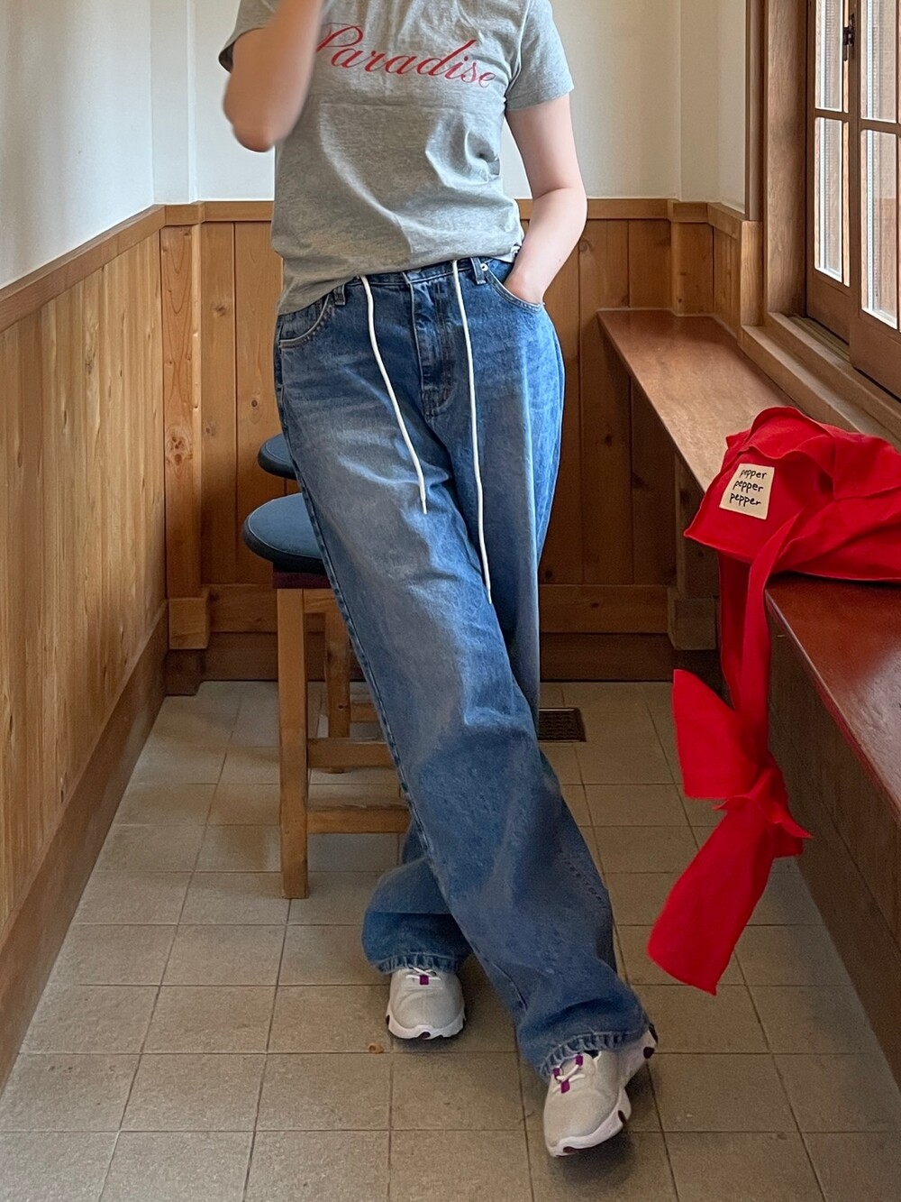 m 총장 104cm / 허리 37cm(스트링조절가능) / 허벅지 35cm / 밑위 34cm / 밑단 23.5cm (모델착용)