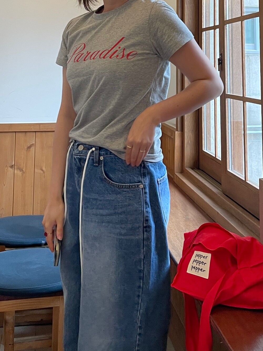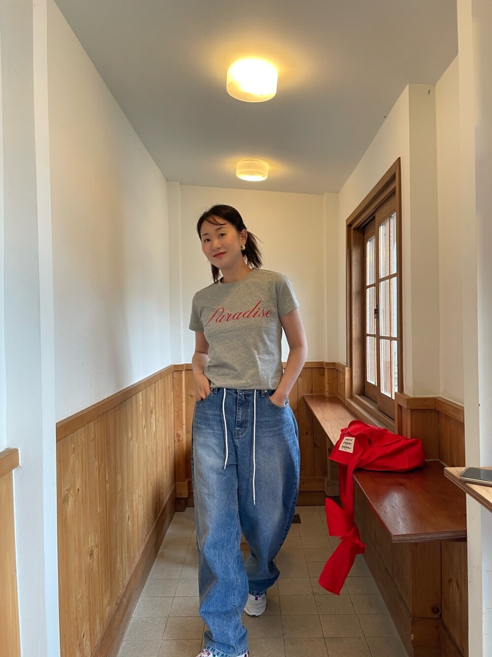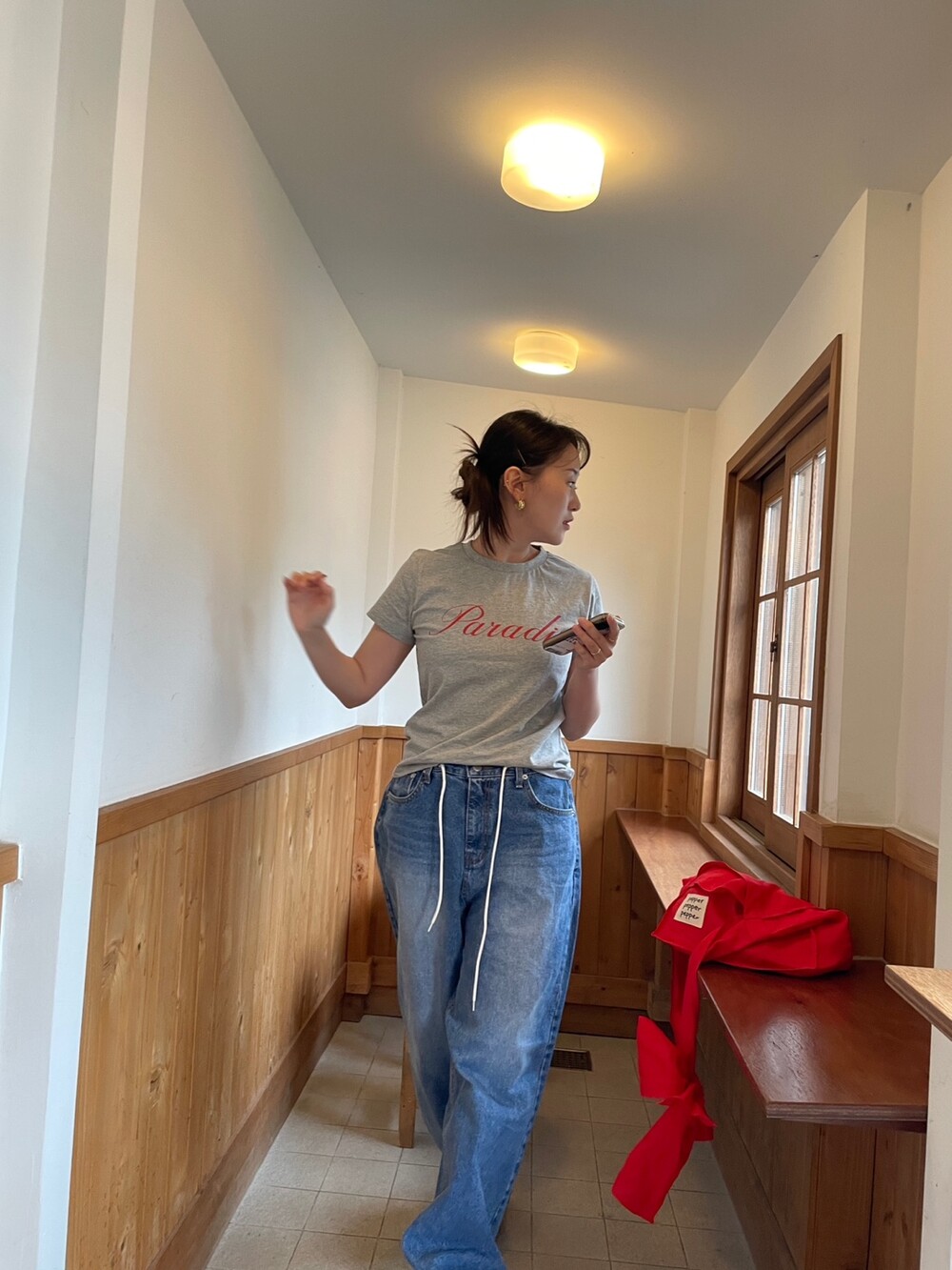 m 총장 104cm / 허리 37cm(스트링조절가능) / 허벅지 35cm / 밑위 34cm / 밑단 23.5cm (모델착용)