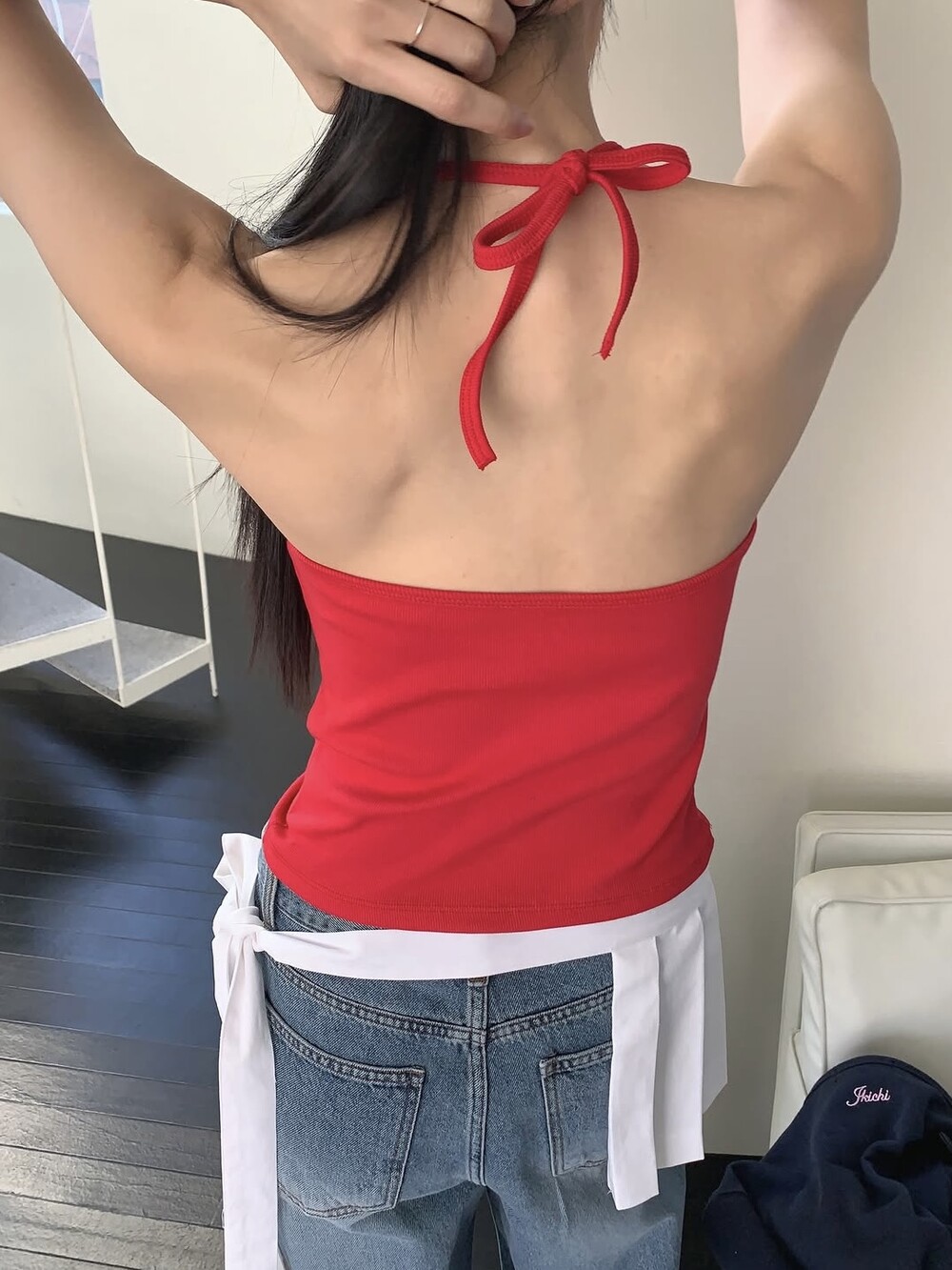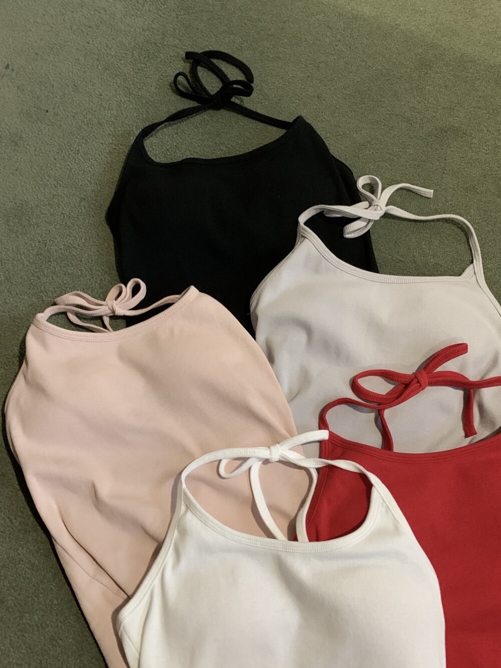 두께감 보통 / 비침 없음 / 신축성 좋음 / 안감 없음 / 브라캡부착되어있음