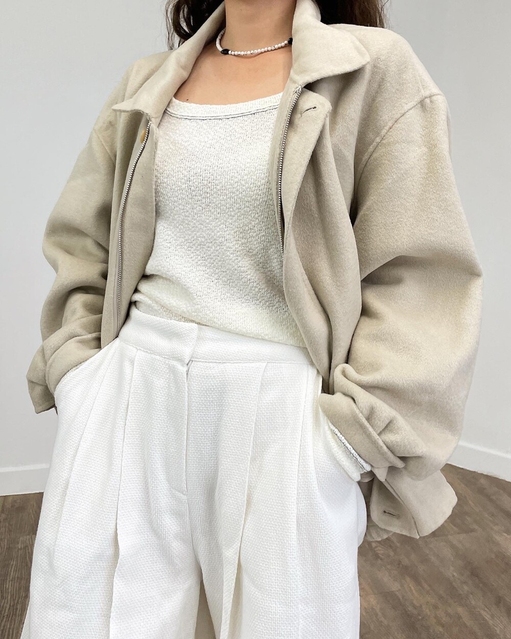 두께감 보통 / 비침 없음 / 신축성 없음 / 안감 있음