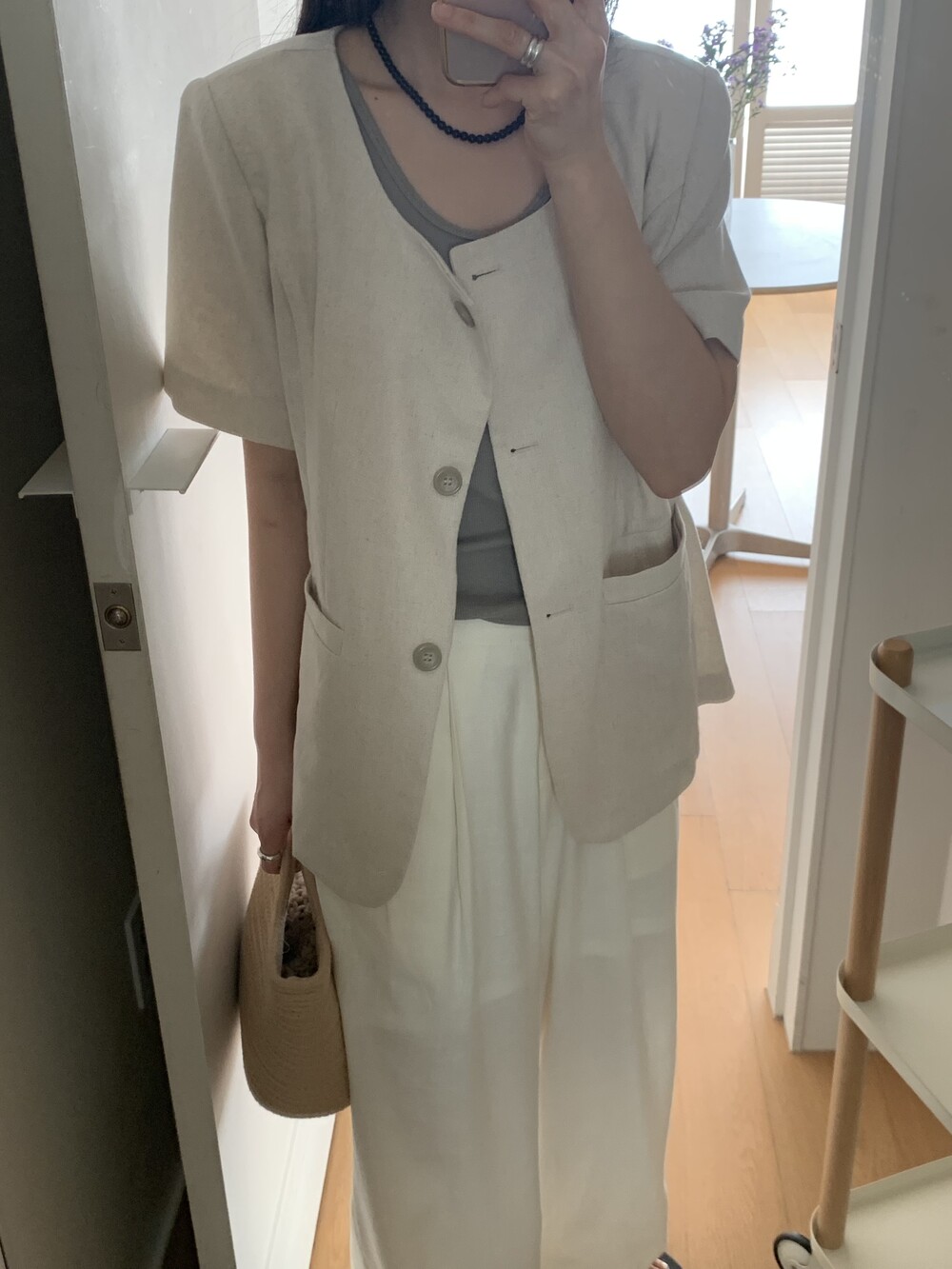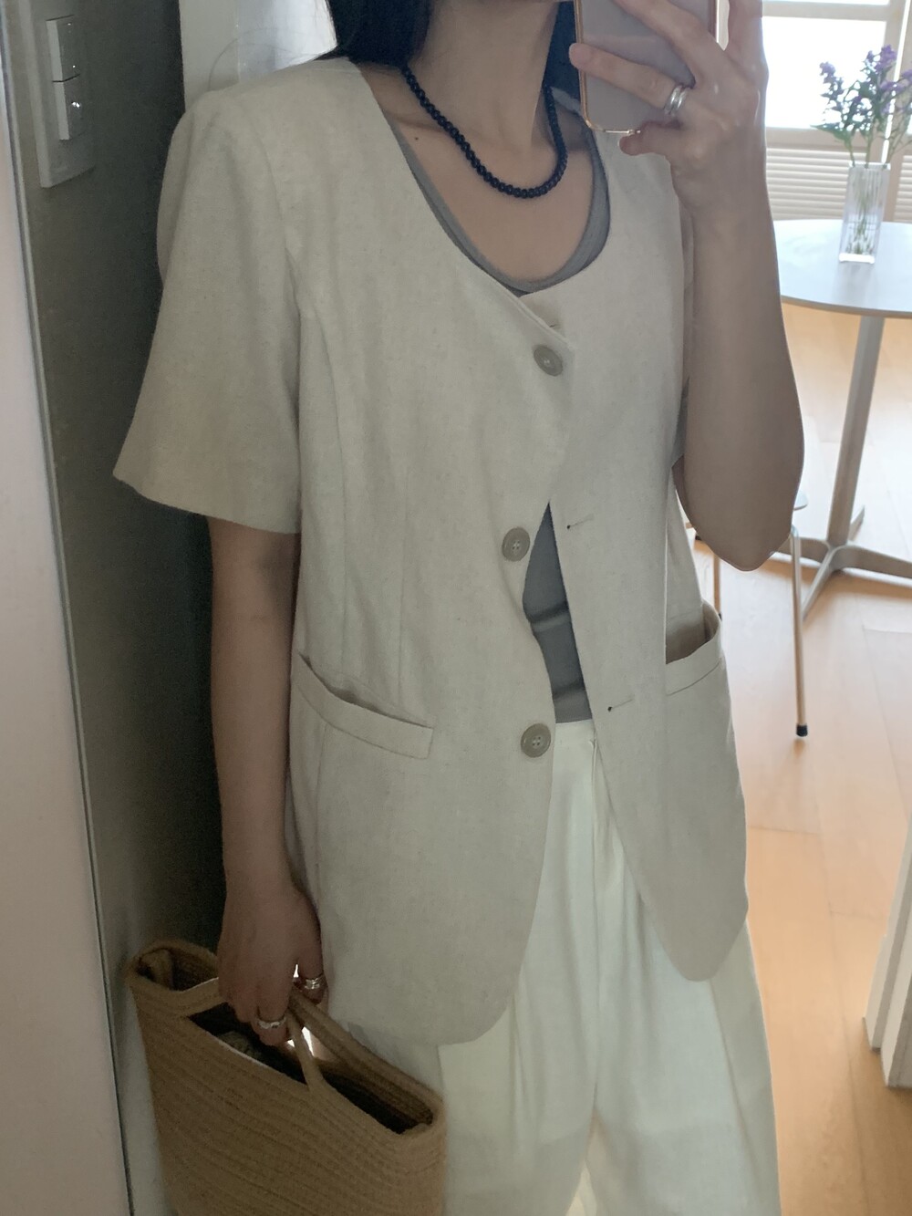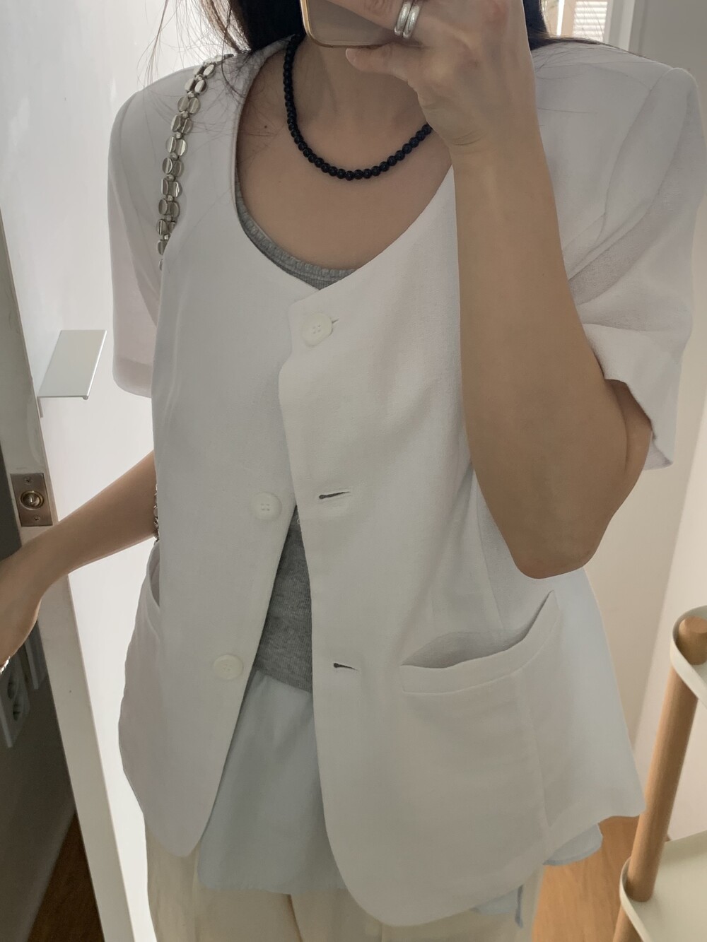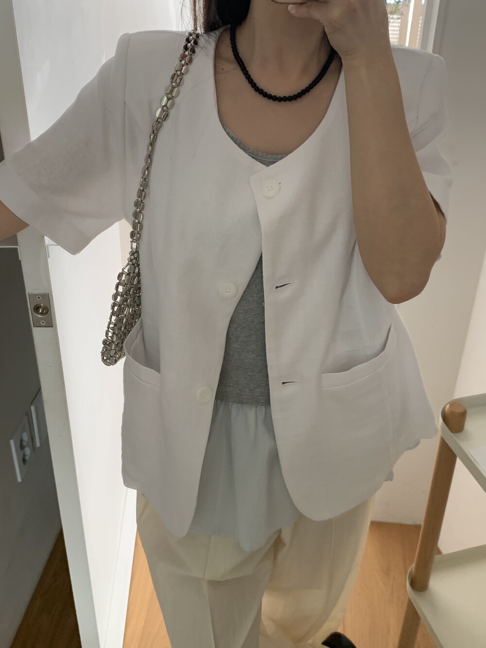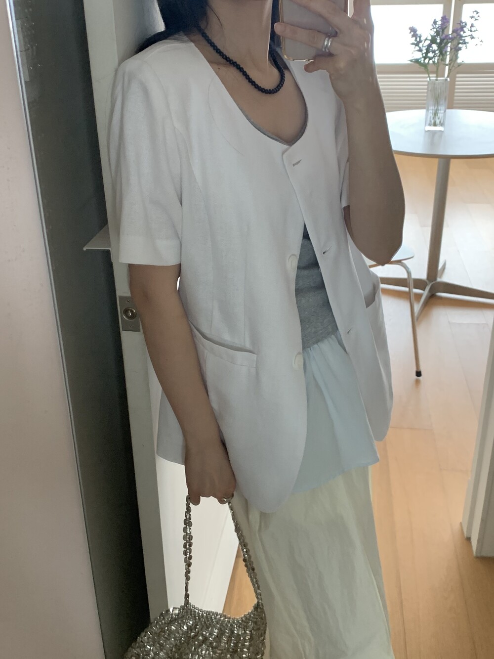 두께감 얇음 / 비침 없음 / 신축성 없음 / 안감 없음 / 어깨패드 있음