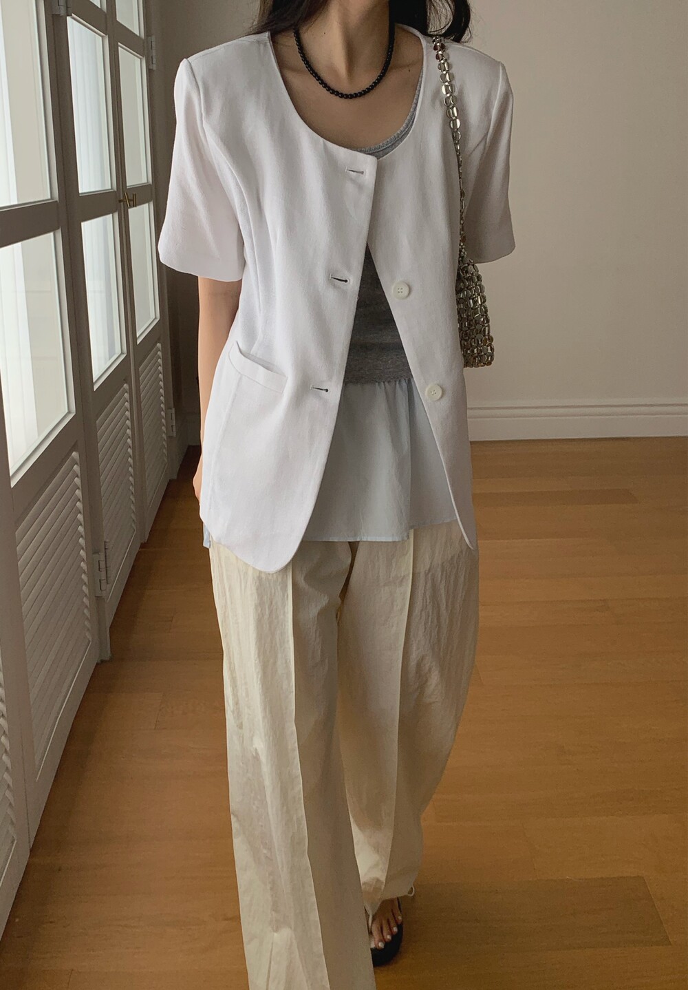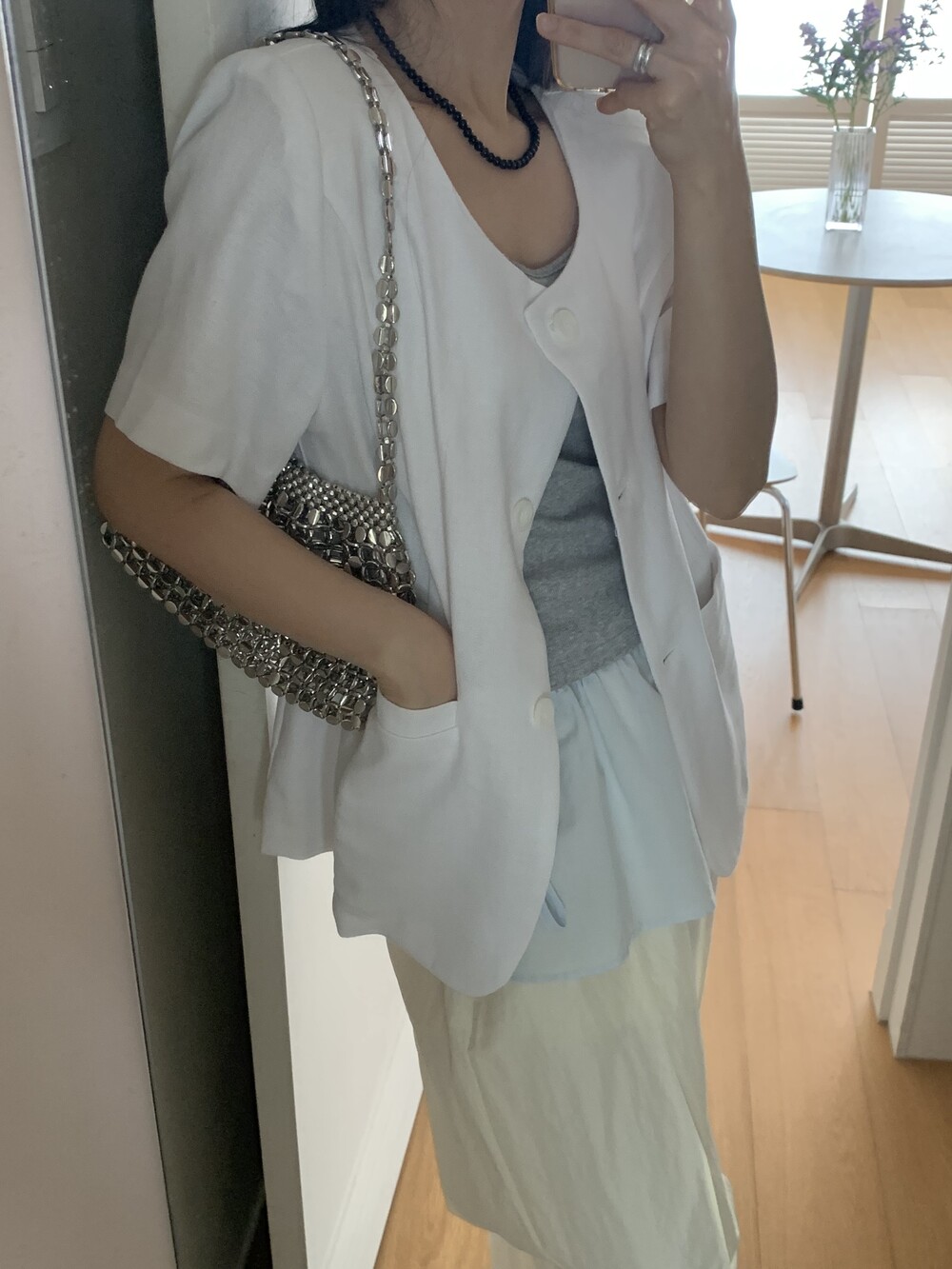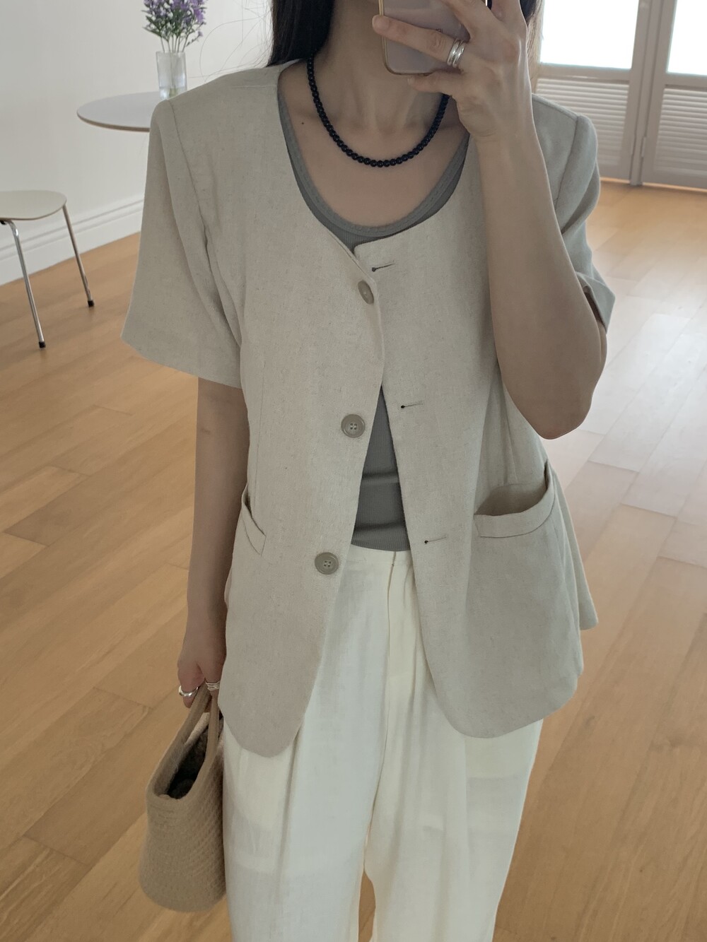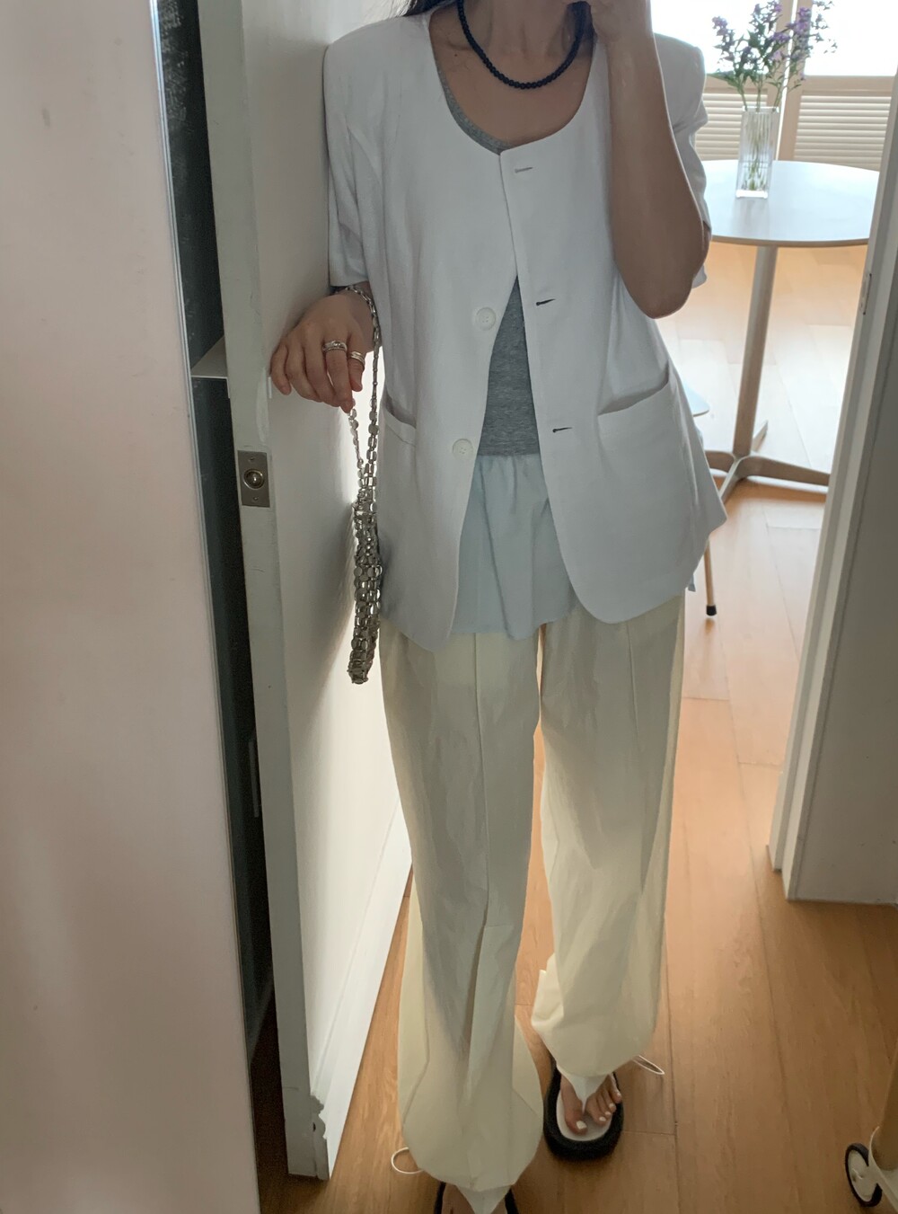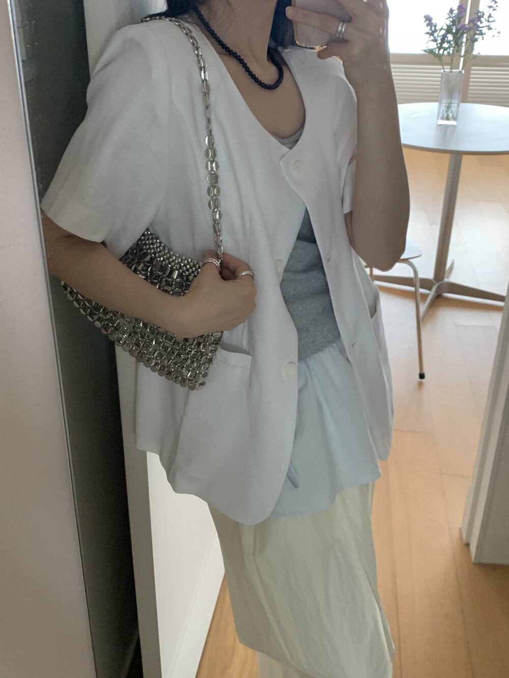 두께감 얇음 / 비침 없음 / 신축성 없음 / 안감 없음 / 어깨패드 있음