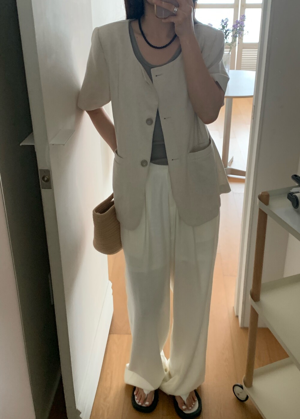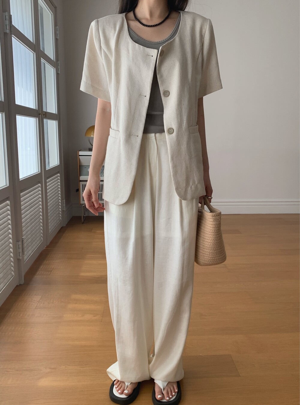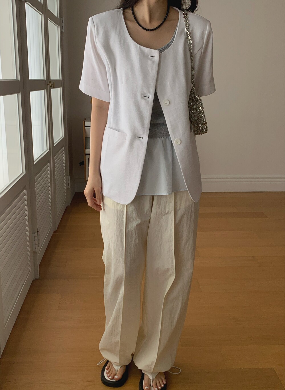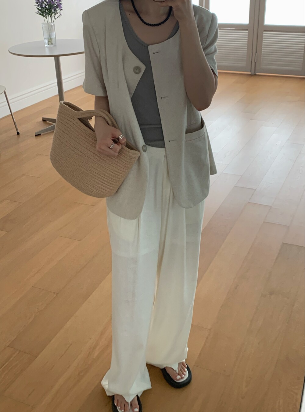 두께감 얇음 / 비침 없음 / 신축성 없음 / 안감 없음 / 어깨패드 있음