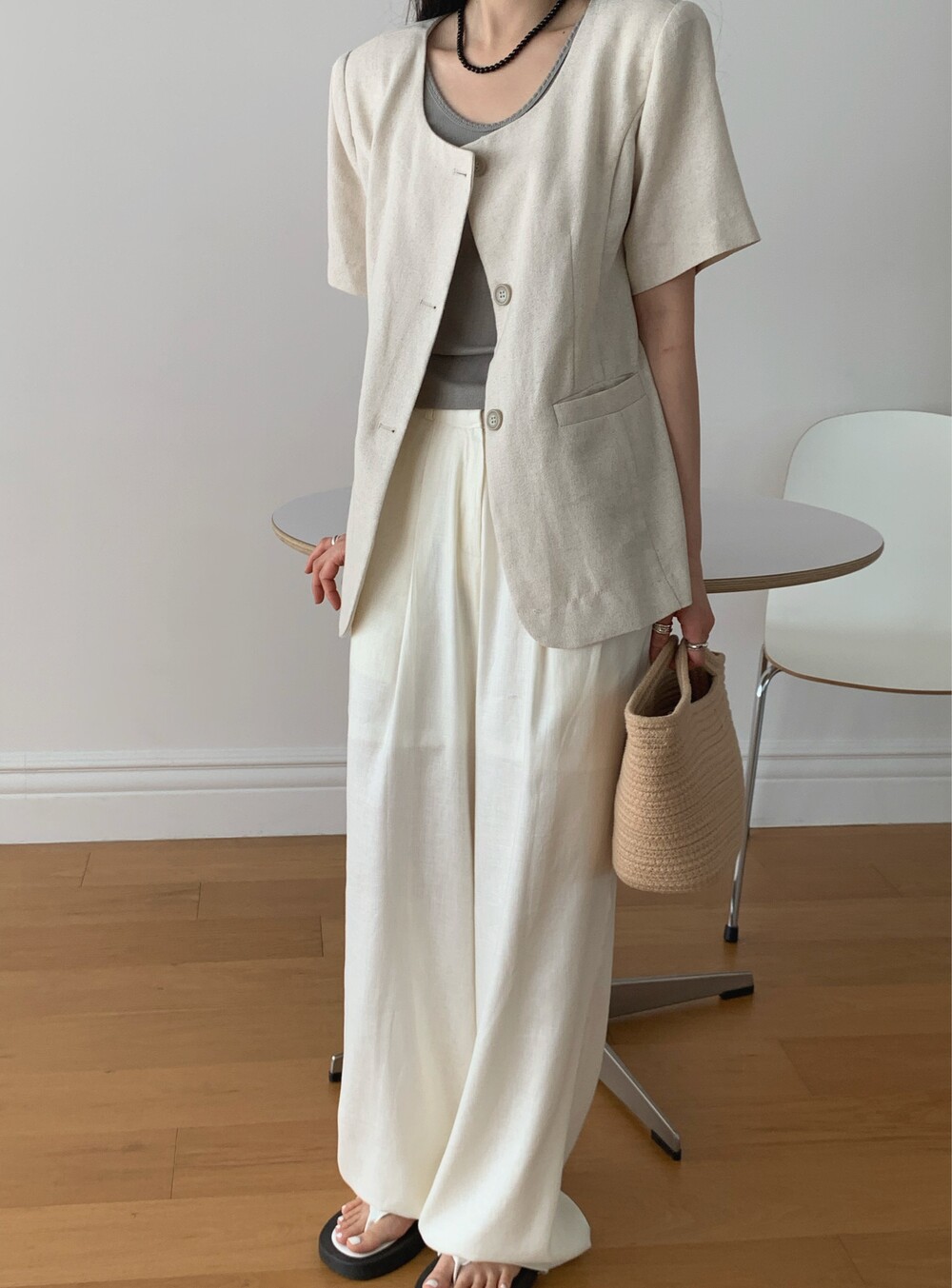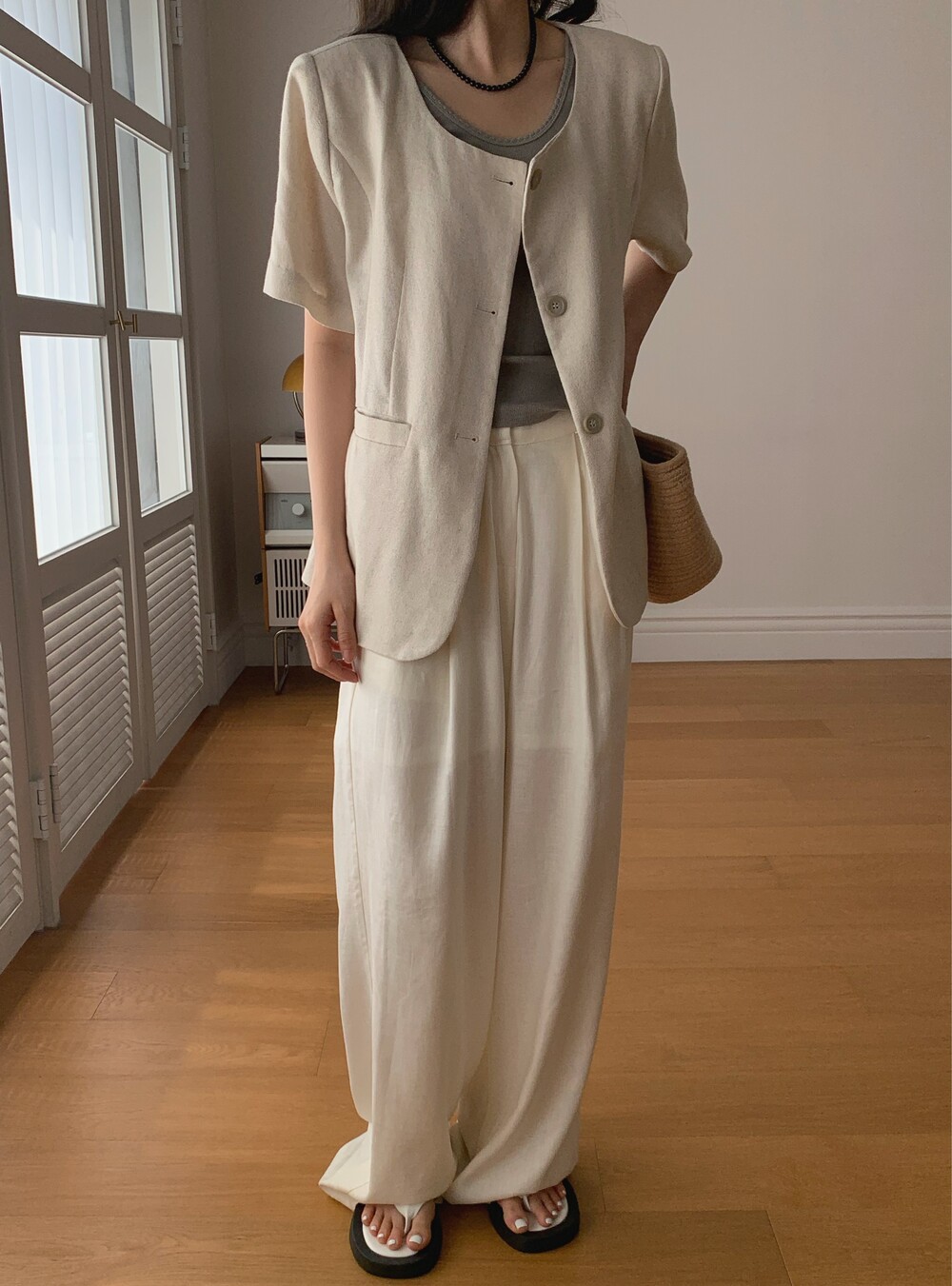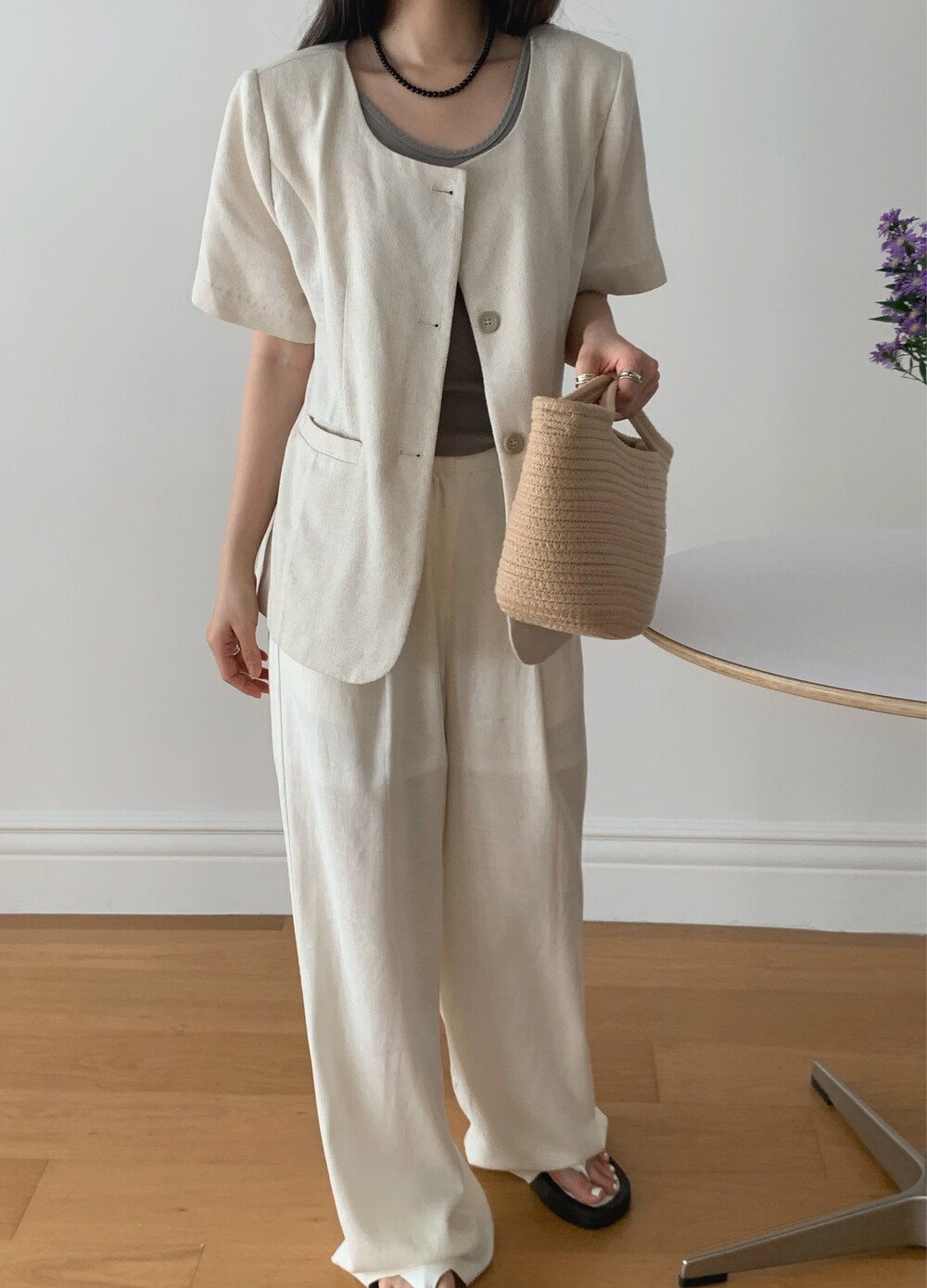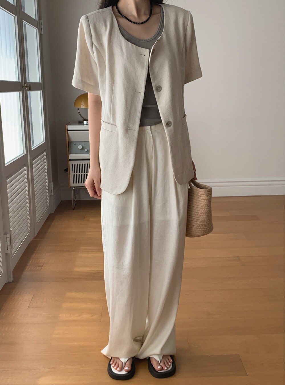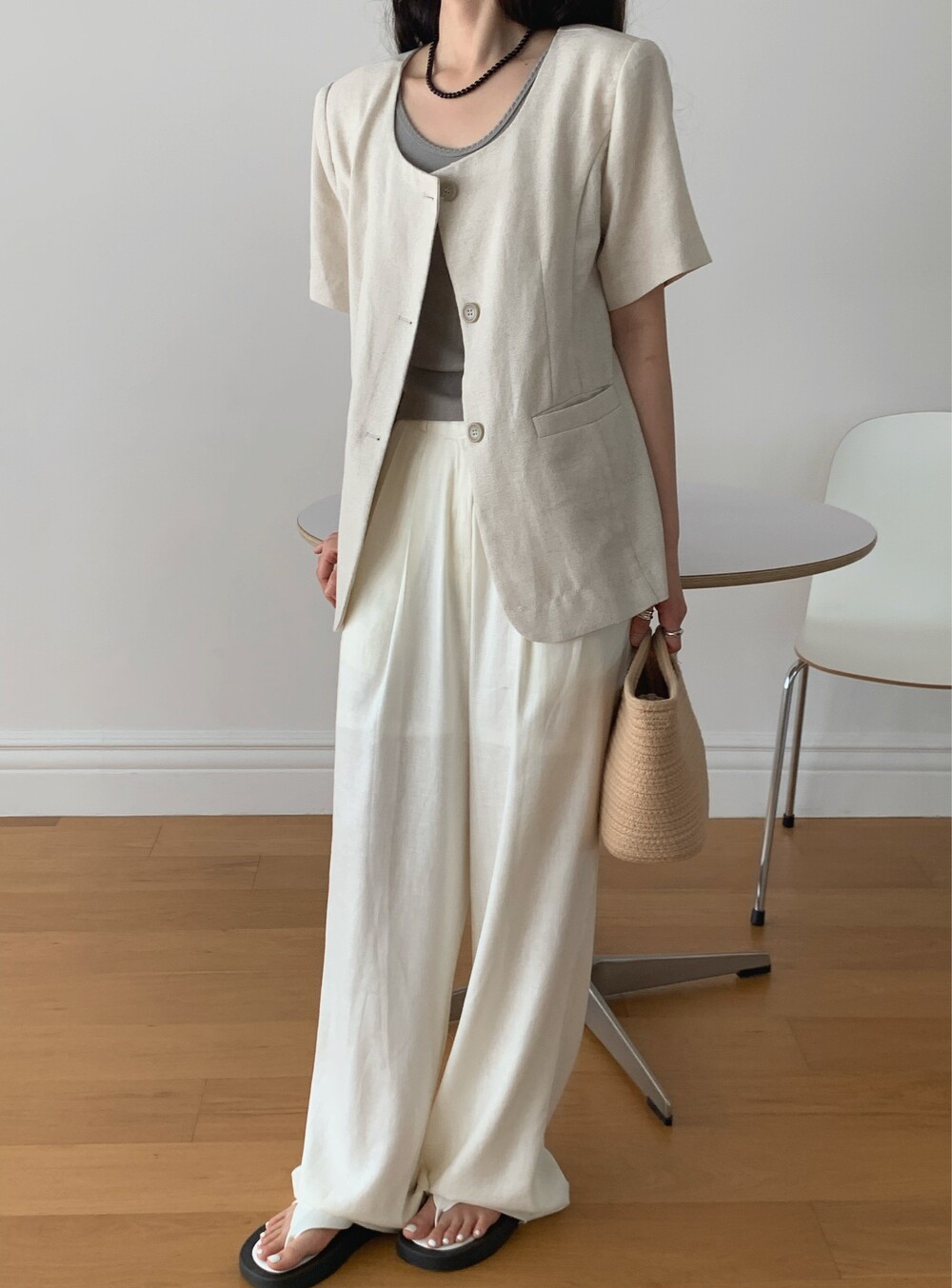 두께감 얇음 / 비침 없음 / 신축성 없음 / 안감 없음 / 어깨패드 있음