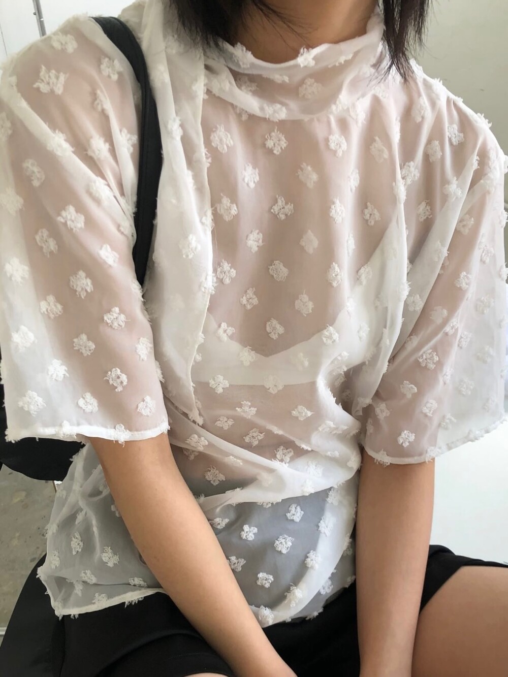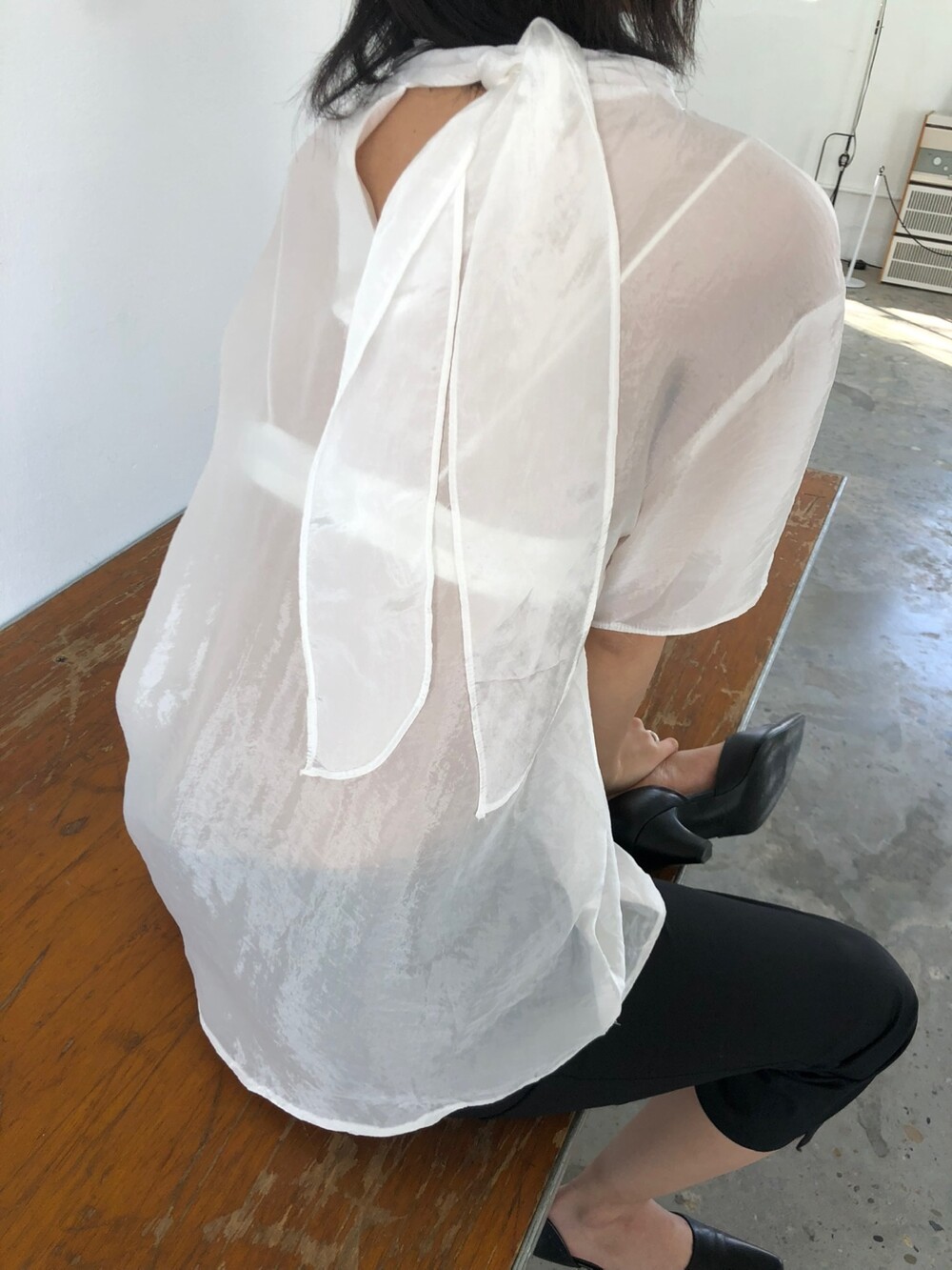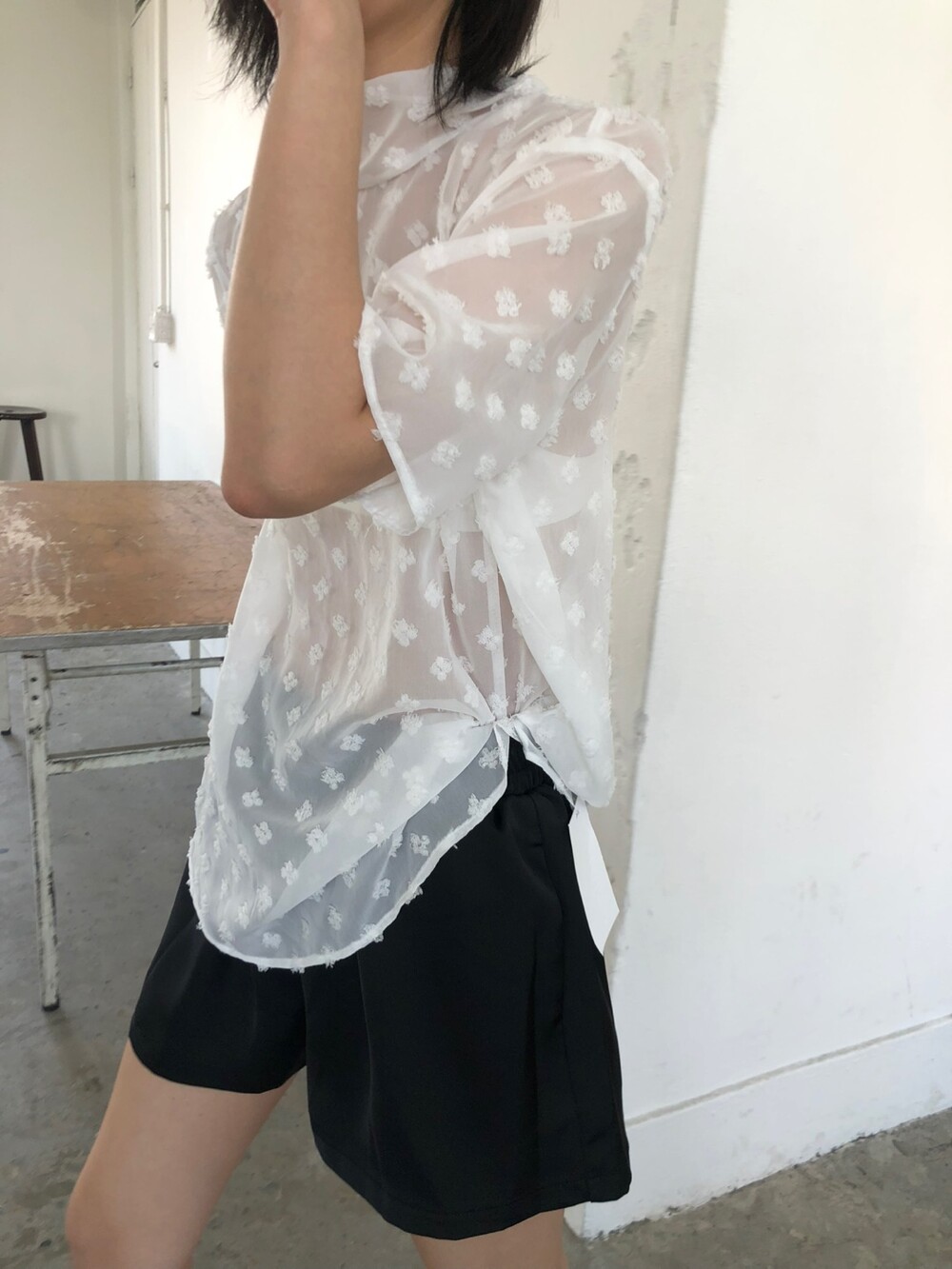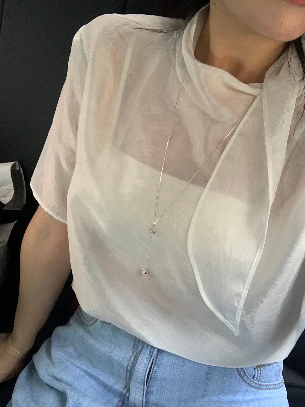 시스루 반팔 타이 블라우스