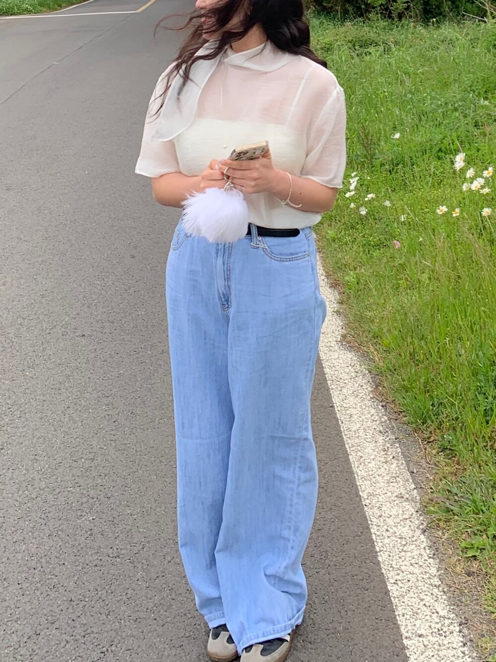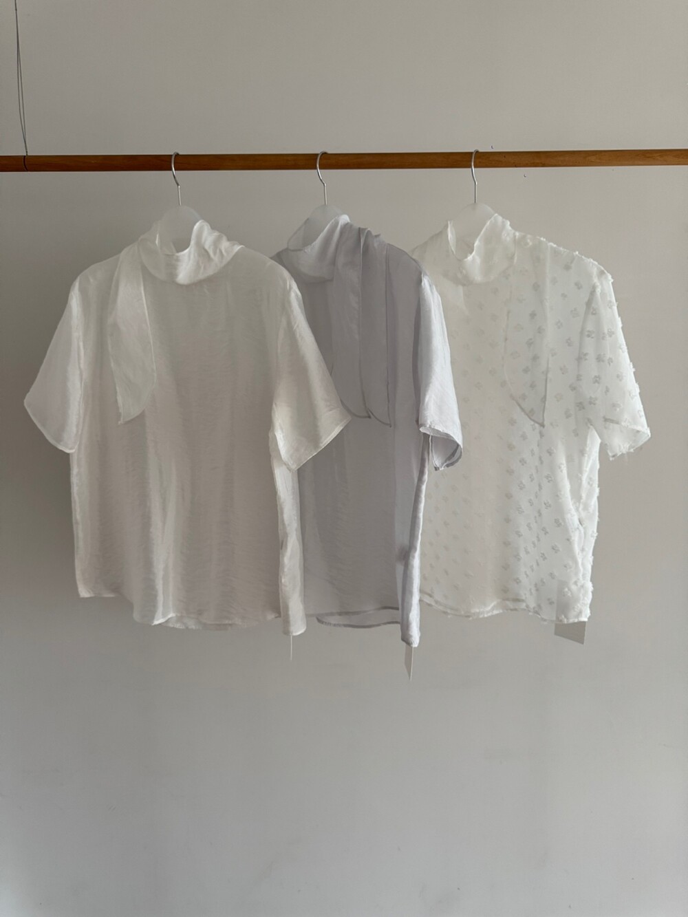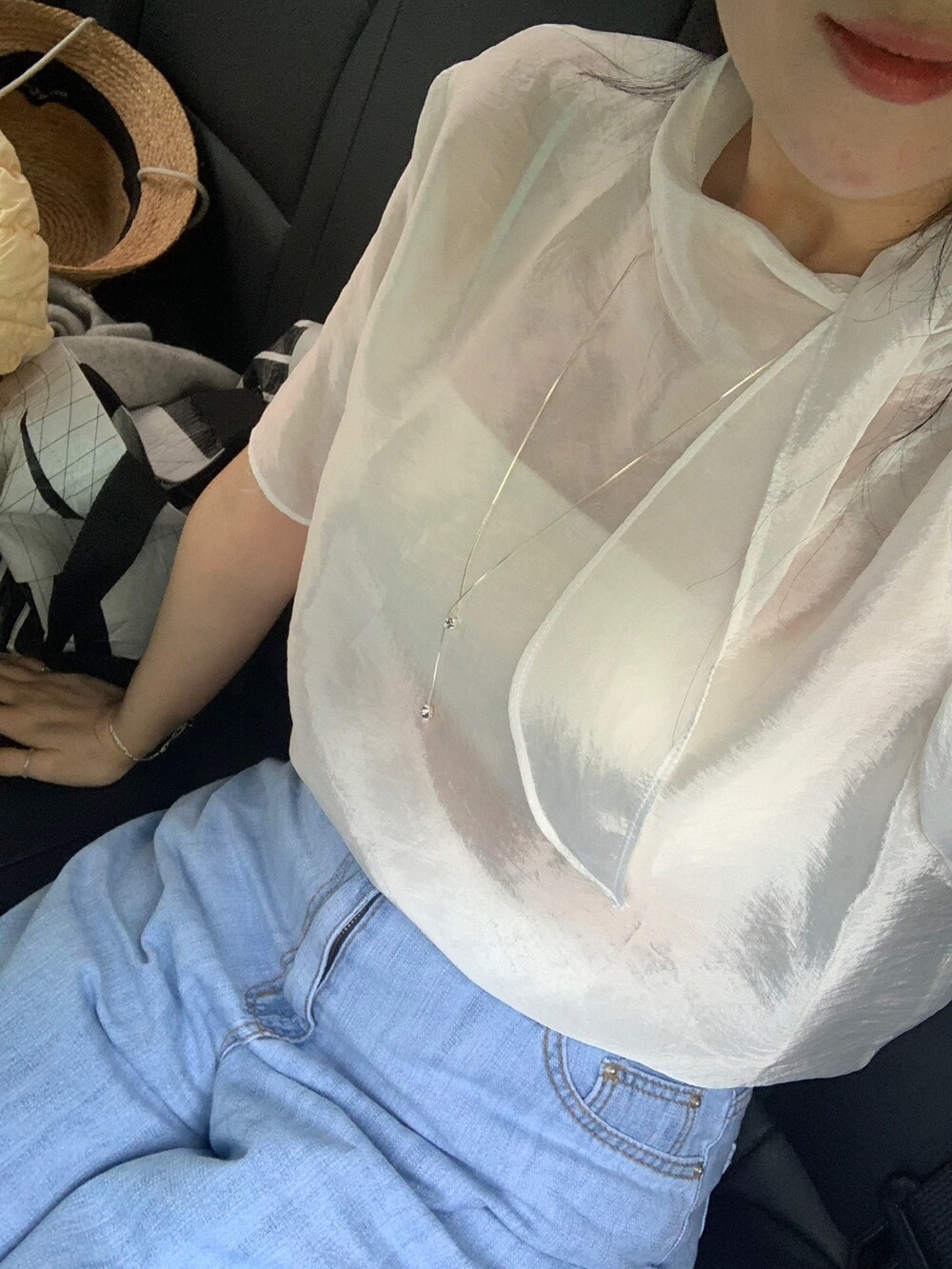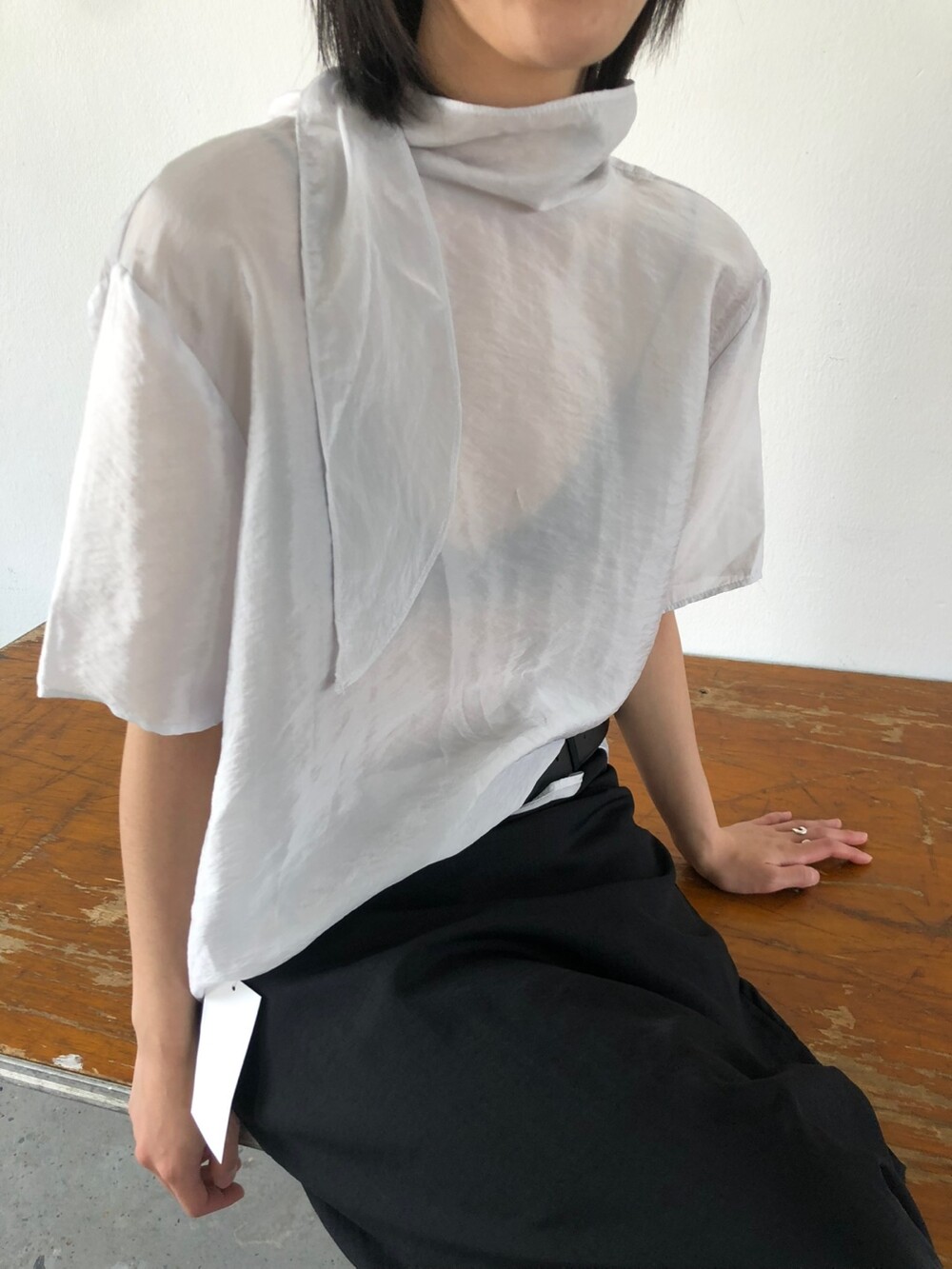 시스루 반팔 타이 블라우스